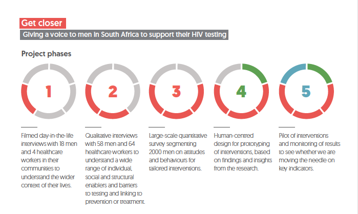 The study started by framing the wider context of men’s lives and how HIV fits within it. To do this, researchers used an ethnographic approach in which trained moderators spent up to 1 day with 18 different men living in high-risk areas of South Africa to understand what daily life is like.