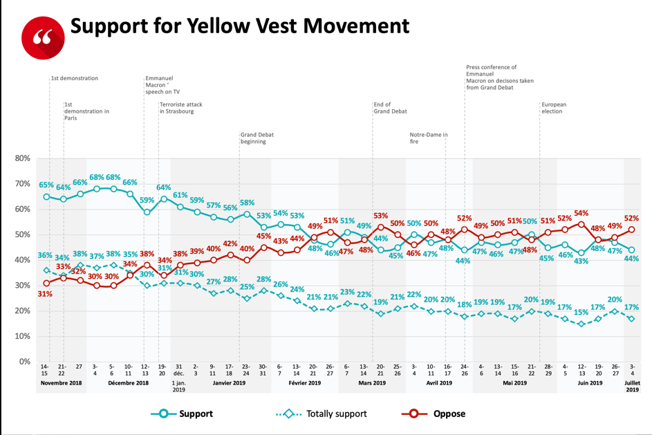 Since the social movement began, it has enjoyed strong public support; it reached 68% in favour ratings in November and December 2018, then dropped to around 58% until the end of January 2019. From February 2019 to present, it stabilised to around 45-48% of support, which is still incredible for a protest that began nine months ago.