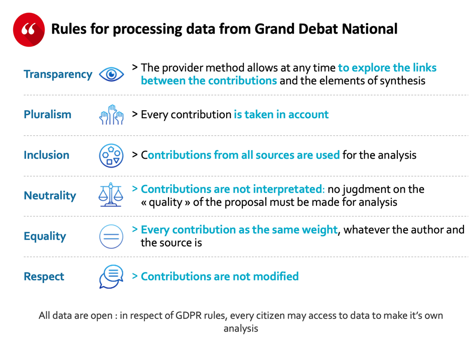 In the end, this mode of analysis was conducted under the constraints of rules enacted by the government, as well as under the protection of a college of guarantors, composed of specialists in public debate and data analysis.