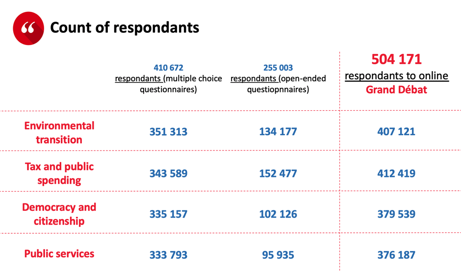 The government advertised Grand Débat a lot in order to involve the population and increase contributions. The participation curve was unusual, and a peak was reached again during the last week, which we never notice usually for this kind of online consultation. In the end, more than 500,000 citizens contributed to the website regarding at least one issue, with more than 255,000 respondents to open-ended questionnaires.