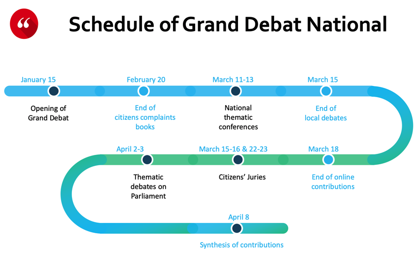 To answer to this protest, President Macron announced in January that a “Grand Débat National” will be held all over the country. A series of town hall-style gatherings were scheduled across France, where citizens could speak to their local mayors about their concerns. During two months, citizens were also allowed to make proposals online at granddebat.fr. Additionally, in March, the government held “regional citizen conferences”, intended to summarise the main findings from the sessions and establish concrete proposals for Macron to consider.
